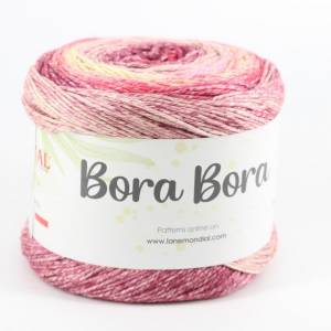 Bora Bora besteht aus natürlichen Fasern aus Baumwolle und Bambus. Diese Mischung erzielt einen schönen Effekt, perfekt zum Stricken Ihrer Frühlings- oder Sommerkleidung.