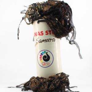 Es una madeja de lana con cintas para buff y bufandas. Es una madeja de lana de terciopelo con seda en el filo haciendo un volante elegante y atractiva. Con una madeja de Lanas Stop Samurai puedes tejer una prenda con agujas de punto . Es una hilatura perfecta para tus bufandas de fiesta ó para darle ese toque de glamour a tus complementos. La poliamida de ésta hilatura hace que tenga un brillo sedoso y una caída muy fluida ideal para chales y foulares.Además podrás tejer los flecos de tus chales con la misma calidad dándo un resultado elegante y glamuroso a tus conjuntos y complementos. Teje glamourosos chales y foulares, con los que te sentirás estilosa y atractiva. Lanas Stop Samurai es un hilo perfecto para tus prendas de fiesta, elegantes y glamourosas. Colores brillantes. Tonos dorados, plateados, cobres y más.