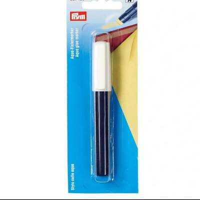 Le marqueur de colle Aqua de Prym convient pour fixer les galons, les lacets et les fermetures à glissière avant de les coudre. Deux lés de tissu peuvent également être collés en un clin d'œil et guidés dans la machine sans pliage ni froncement. Il y a une cartouche contenant de la colle textile pigmentée jaune à l'intérieur du bâton de colle; cette coloration jaune n'est plus visible, une fois la colle sèche. Le lavage du tissu dissout complètement la colle, sans laisser de traces.