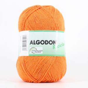 100 grammi, 70% cotone riciclato, 30% poliestere riciclato, aghi da 3-4 mm, uncinetto da 3-4 mm, 250 metri